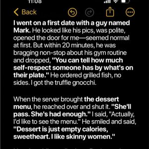 I went on a first date with Mark—charming at first, but by dinner, his true colors showed. When the dessert menu came, he scoffed, “Dessert is just…