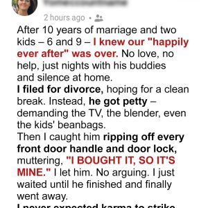 After her divorce, Alice expected tension—but not her ex-husband Mike’s pettiness. He took everything he claimed to have paid for, from beanbags to door handles, trying to…