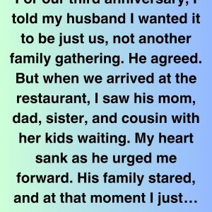For their third anniversary, a woman asked her husband for something simple: a quiet evening, just the two of them. He agreed — but at the restaurant,…