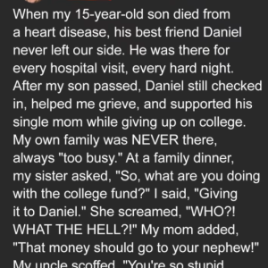 After losing my 15-year-old son Ben, I expected family support—but they stayed silent through his illness. His best friend Daniel, however, never missed a hospital visit, bringing…