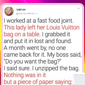 While working at a fast-food restaurant, I noticed a woman had left her Louis Vuitton bag on a table. After waiting and seeing no sign of her…