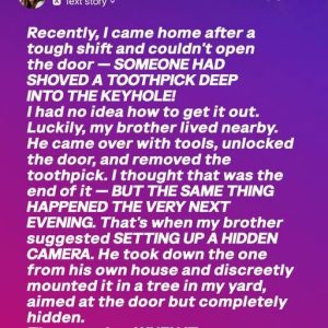 After a grueling 14-hour hospital shift, I came home desperate for pizza and a shower—only to find my front door jammed. A toothpick had been shoved into…